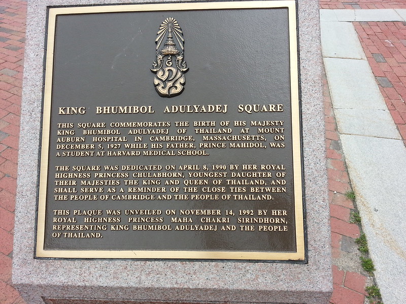 จัตุรัสภูมิพลอดุลยเดช (King Bhumibol Adulyadej of Thailand Square) ณ เมืองเคมบริจด์ รัฐแมสซาชูเซตส์ ประเทศสหรัฐอเมริกา จตุรัสนี้ตั้งอยู่บริเวณถนน Iliot ตัดกับถนน Bernett หน้าโรงแรมชาร์ลส์ใกล้กับ Harvard Square ที่ชาวไทยในสหรัฐต่างเคยคุ้นหูและรู้จักกันดีสถานที่นี้ นับเป็นสถานที่ประวัติศาสตร์ที่สำคัญยิ่งแห่งหนึ่งของประวัติศาสตร์ไทย เนื่องจากเป็นสถานที่ประสูติของพระบาทสมเด็จพระเจ้าอยู่หัวภูมิพลอดุยเดช