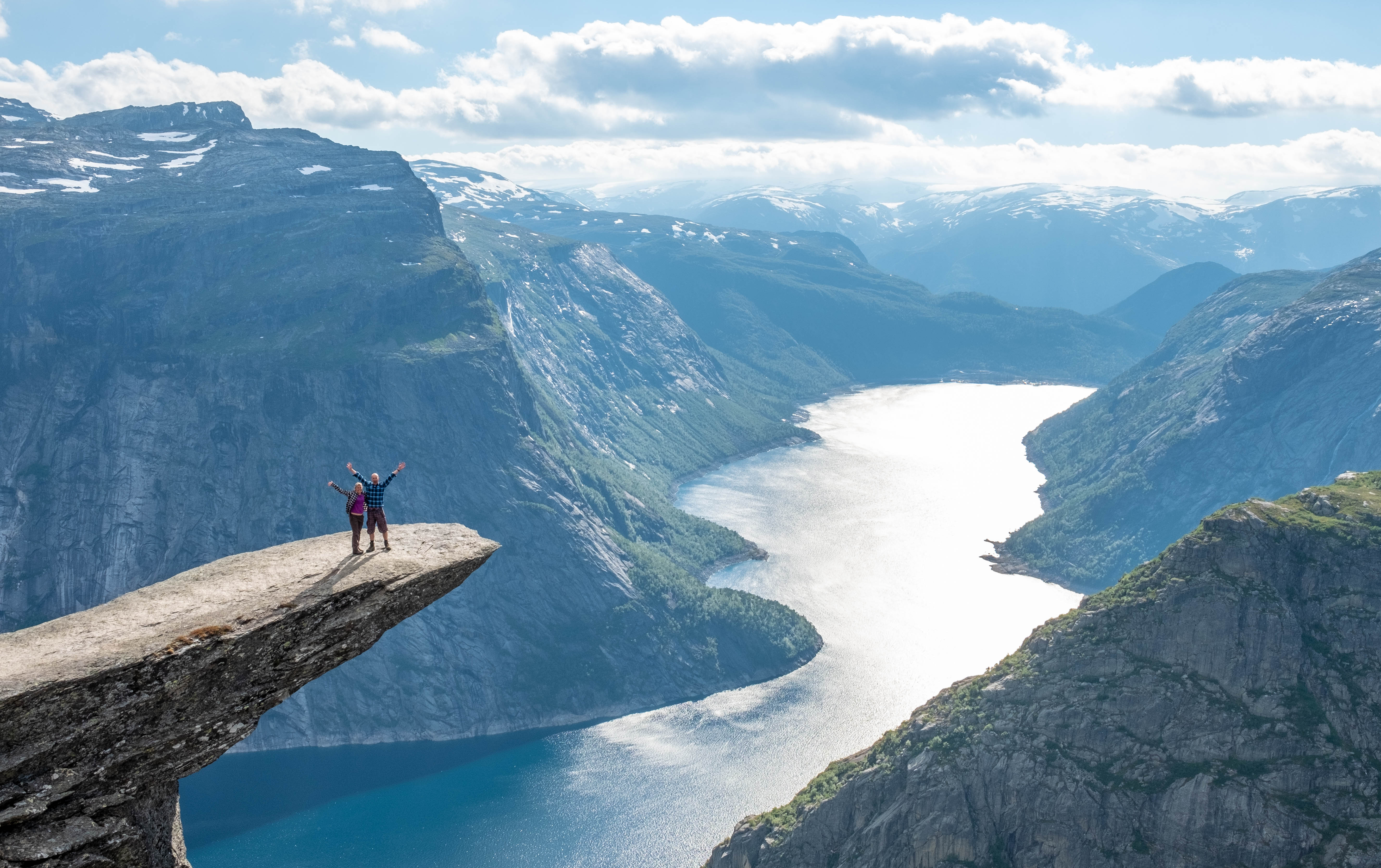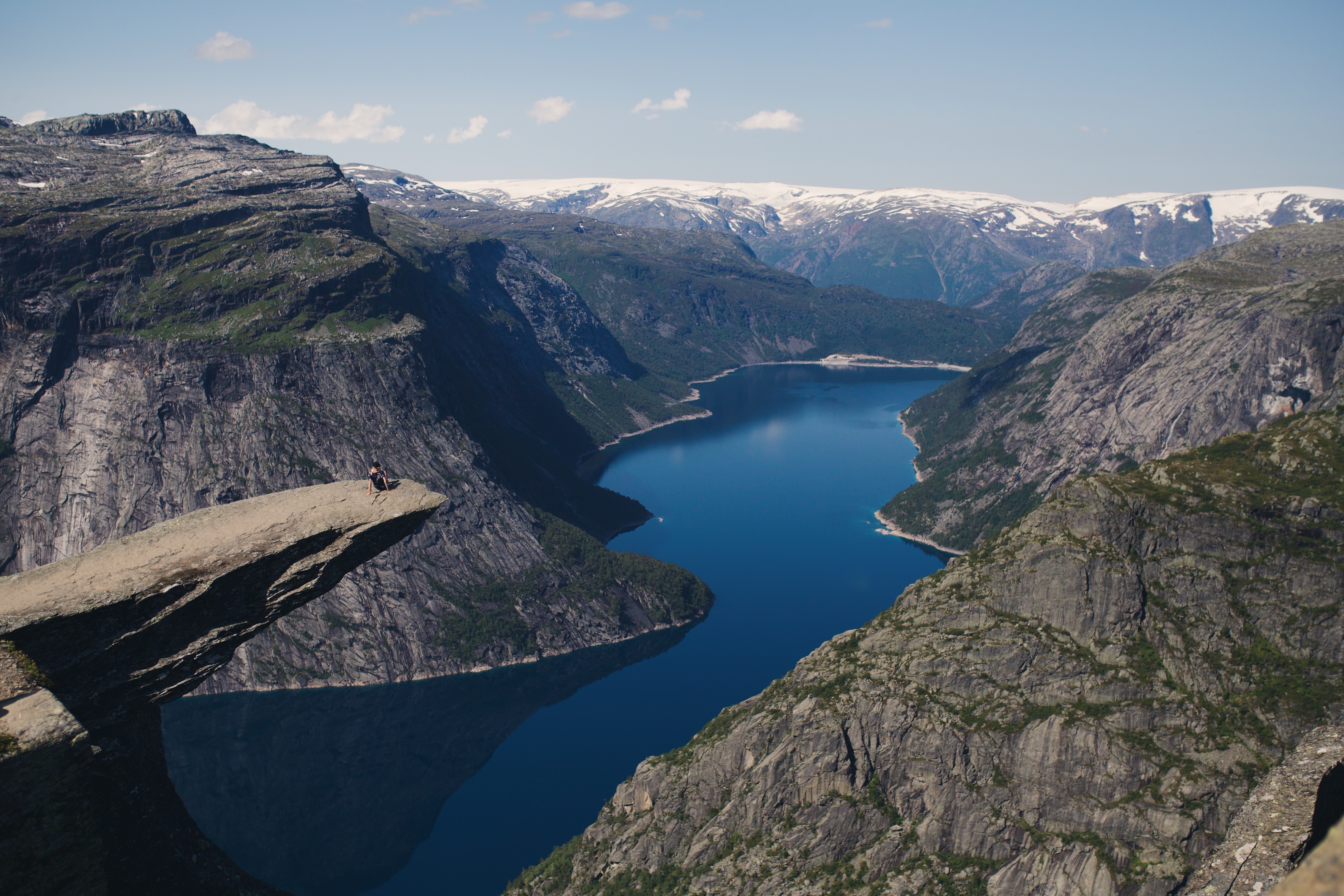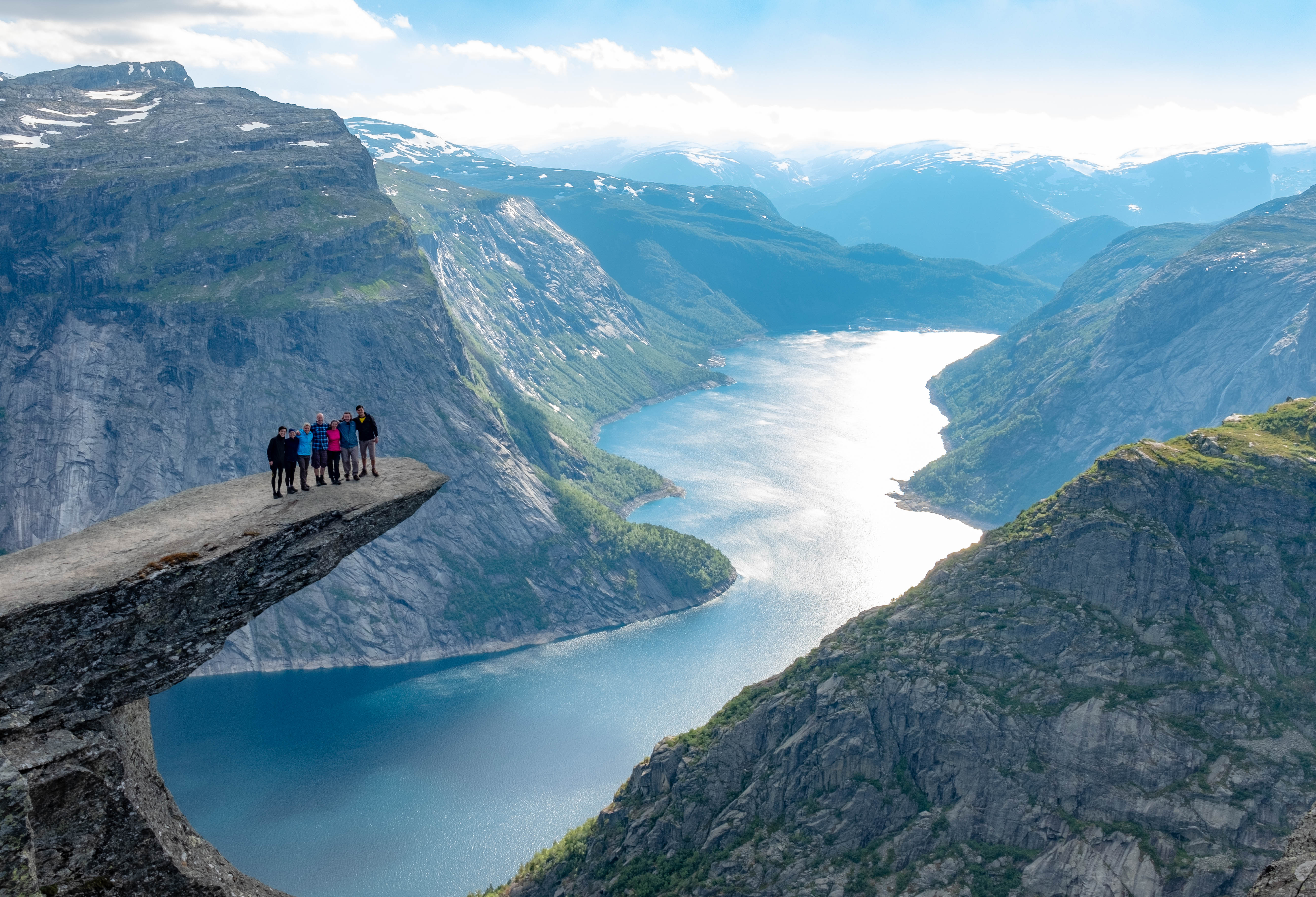 หน้าผาโทรลล์ทุงก้า (Trolltunga) ชะง่อนผาที่ดูน่ากลัวมีความสูง 700 เมตรเหนือทะเลสาบแต่วิวเบื้องหน้าก็สวยงามมากที่สุด การจะไปที่นี่ไม่ง่ายนักเพราะต้องเดินทางขึ้นเขาไป - กลับกว่า 9 ชม.ไปได้ตั้งแต่เดือนมิถุนายน - เดือนกันยายนเท่านั้น ยังเป็นสถานที่ท่องเที่ยวที่ติดอันดับหนึ่งในสถานที่ท่องเที่ยวที่คนอยากไปถ่ายรูปที่สุด